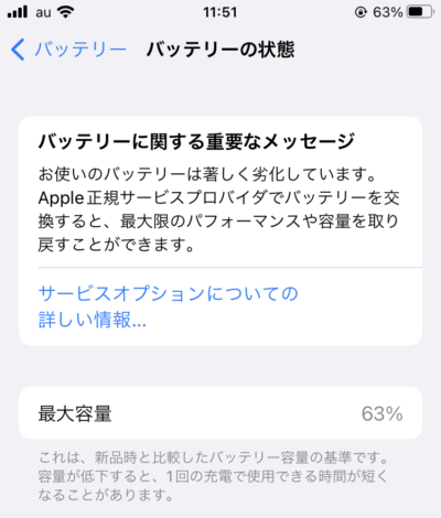 iPhone7にしてから一度もバッテリー交換したことがなく、とうとう63%に。